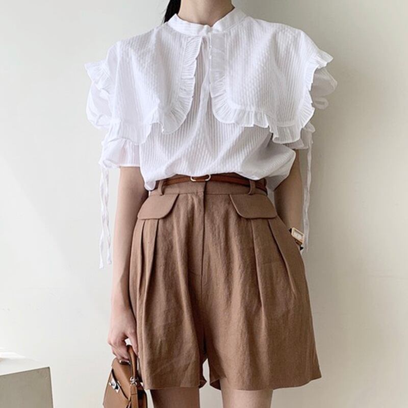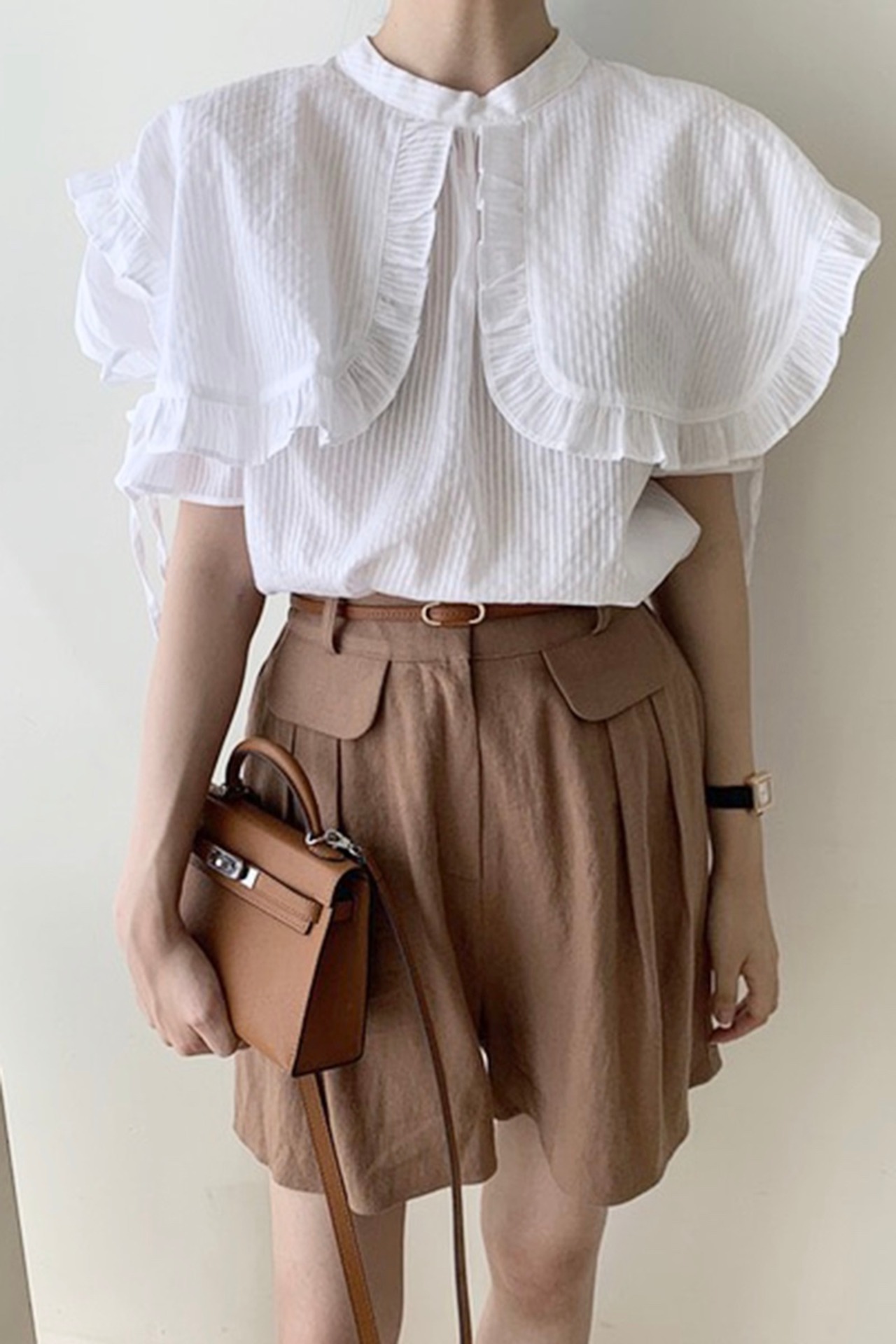 2色展開 ビッグフリル 半袖シャーリングトップス ブラウス【ホワイト(白)/ベージュ】