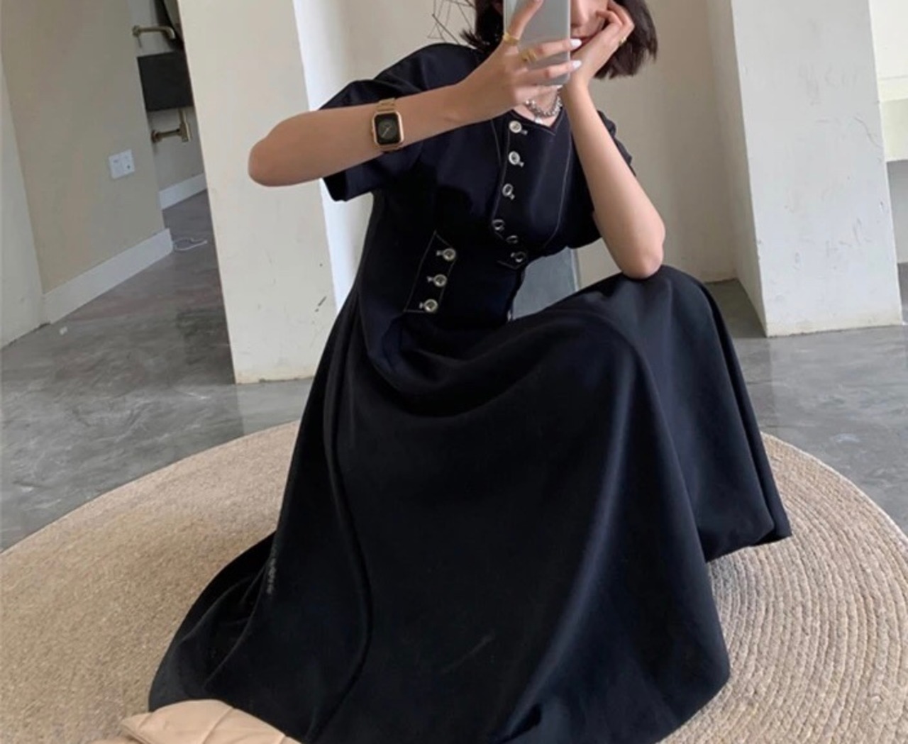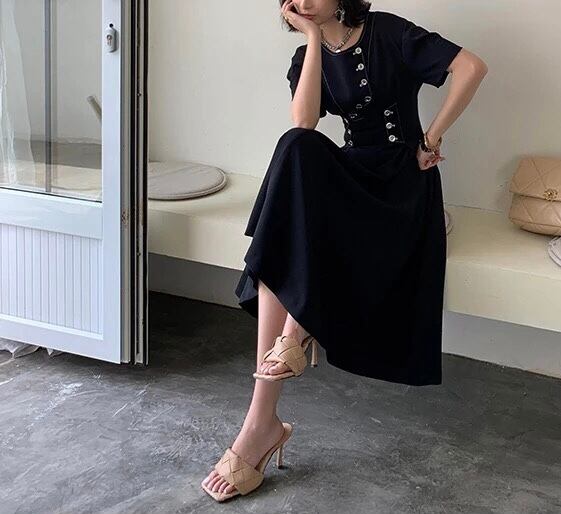 切り替えしデザインに沿って並んだボタンデザインが可愛いワンピース。