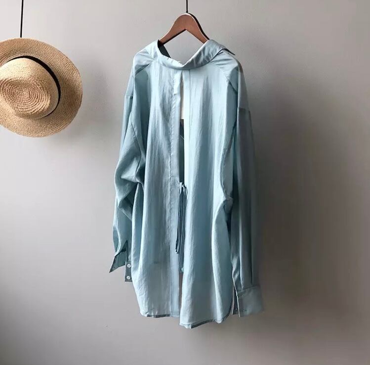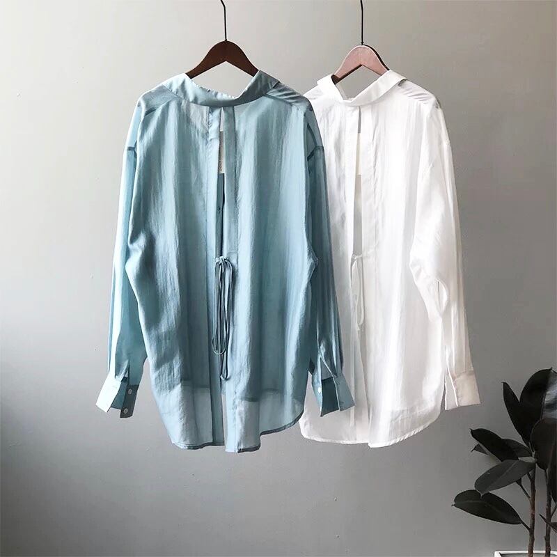 2色展開 ロングスリーブテンセルシャツ バックリボン【ホワイト(白)/ブルー】