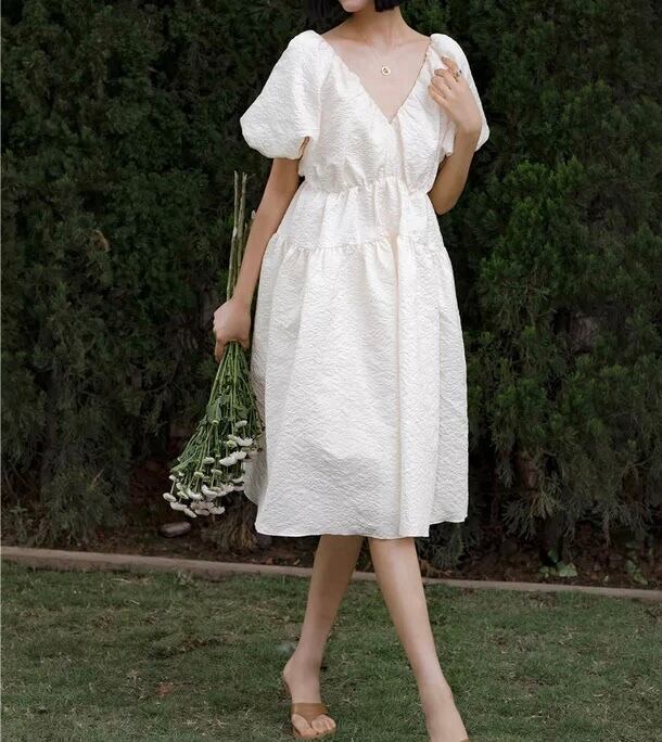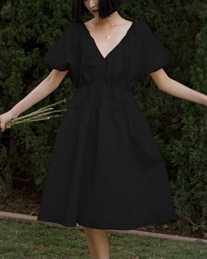 2色展開 Vネック オフショルダー ボリュームワンピース【オフホワイト/ブラック】