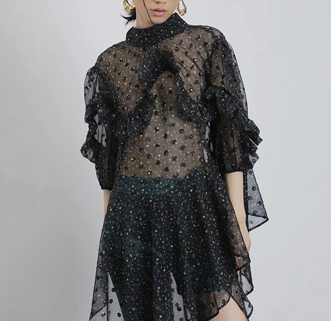 ドットと小花柄のミックスが可愛いシースルー生地で、デザイン性も高いお洒落ブラウス。