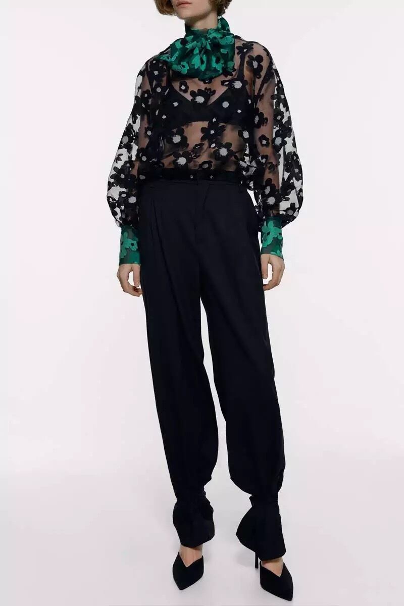 グリーンとブラックのバイカラーが目を引くシースルーブラウス。