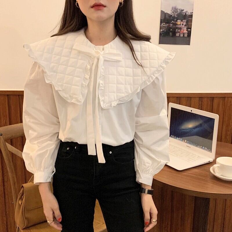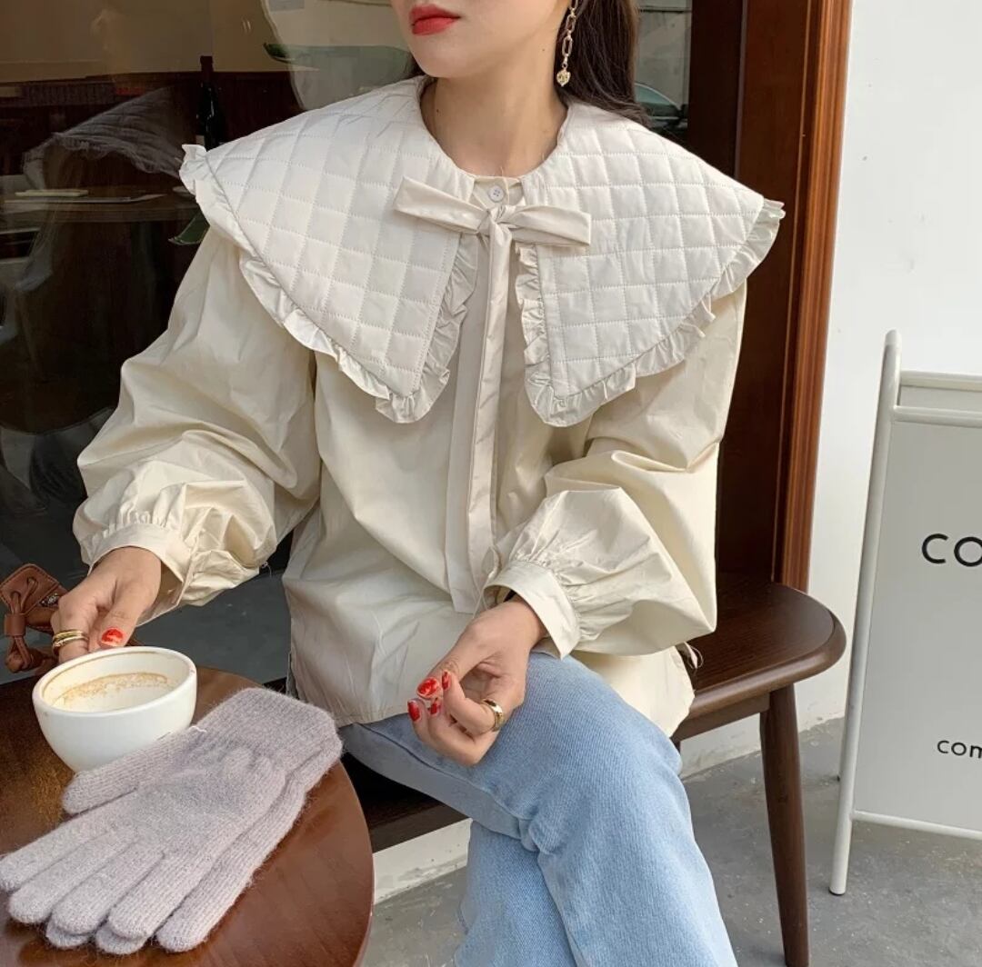 2色展開 ダウン地ビッグカーラーパフスリーブブラウス シャツ【オフホワイト/ホワイト(白)/キャメル(茶色)】