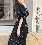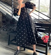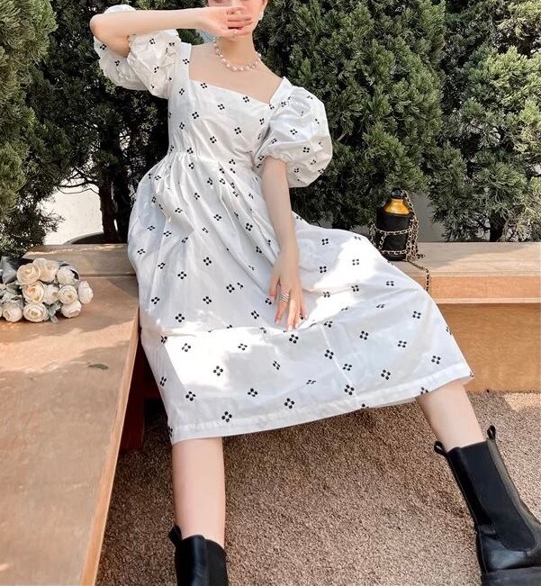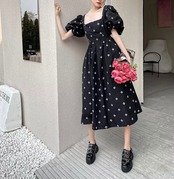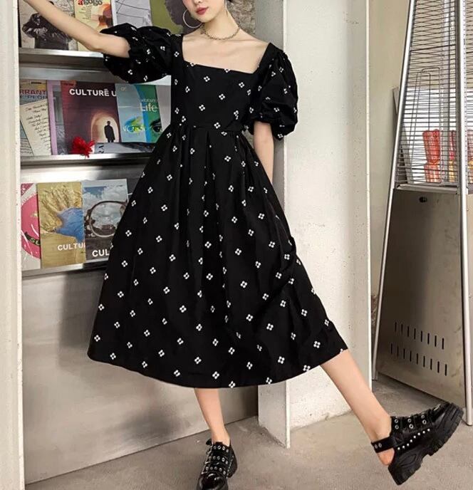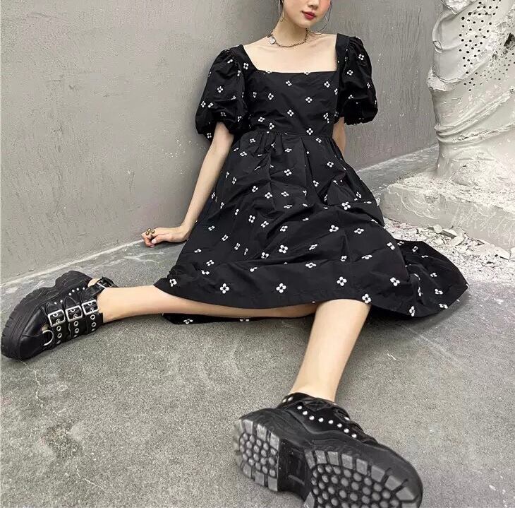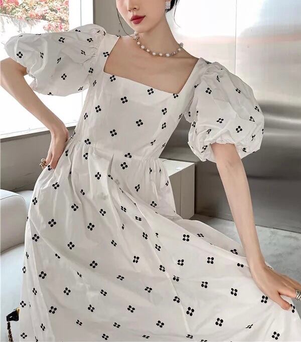 ミニフラワー パフスリーブワンピース【ブラック(黒)/ホワイト(白)】