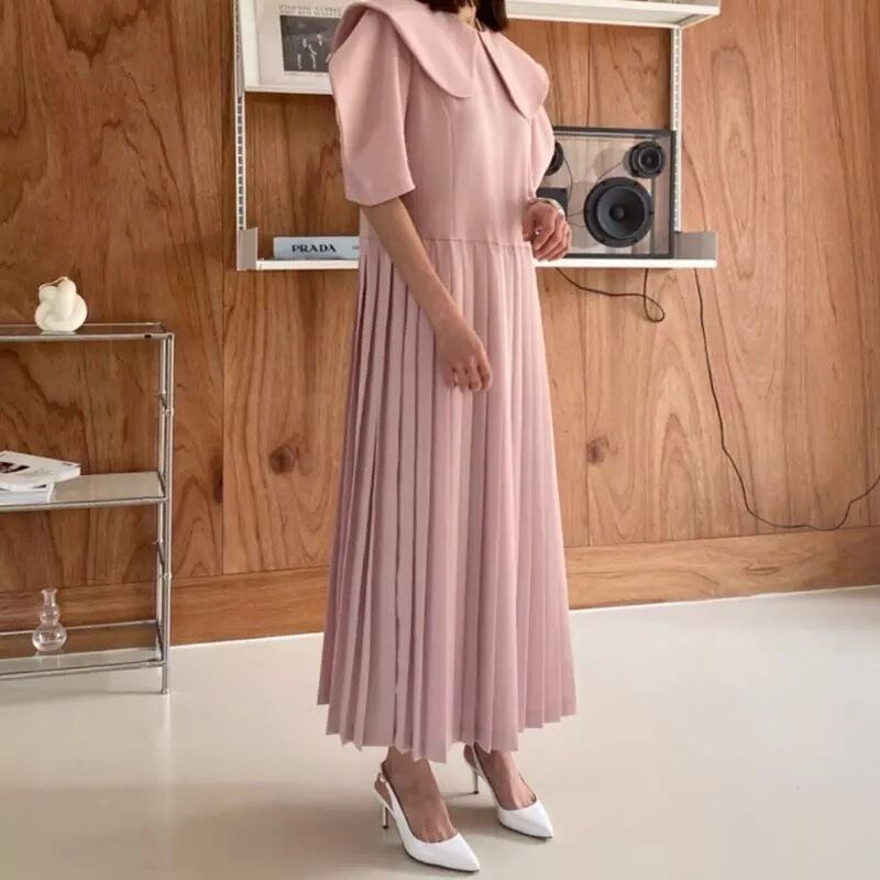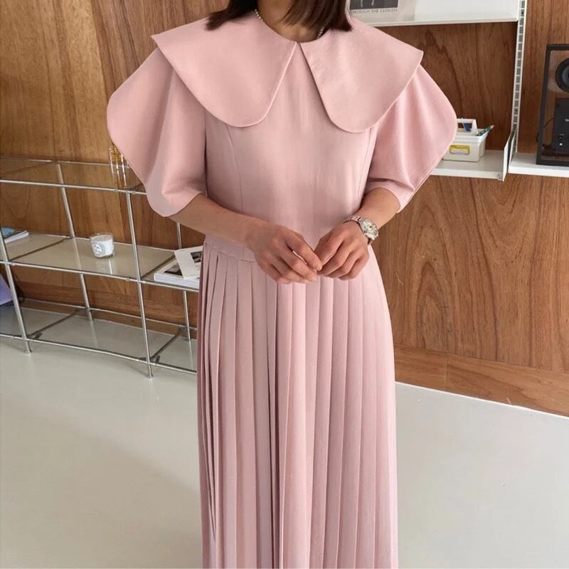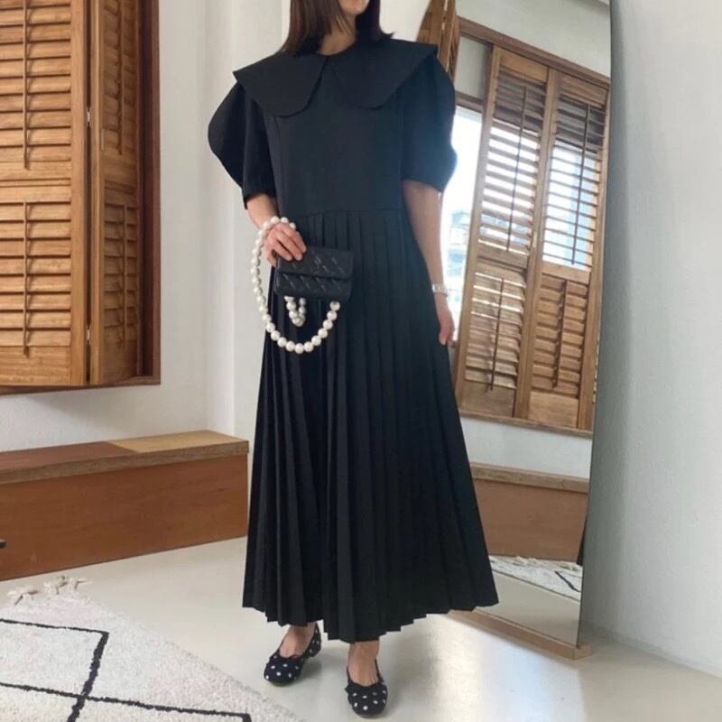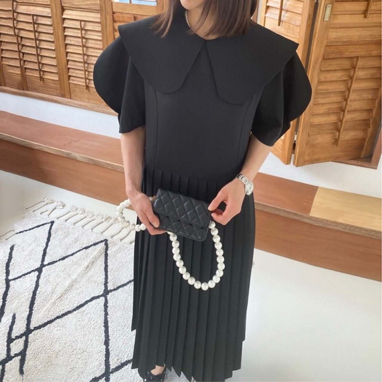 丸みのある大きな襟とボリューミーな袖が可愛いプリーツワンピース。