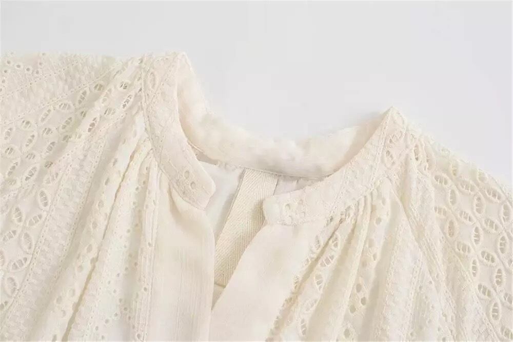 ベージュがかったオフホワイトカラーと刺繍メッシュの掛け合わせが柔らかさを感じさせるワンピース。