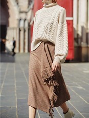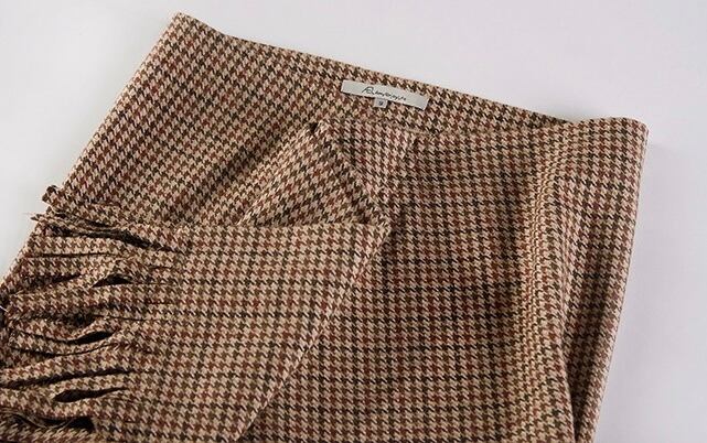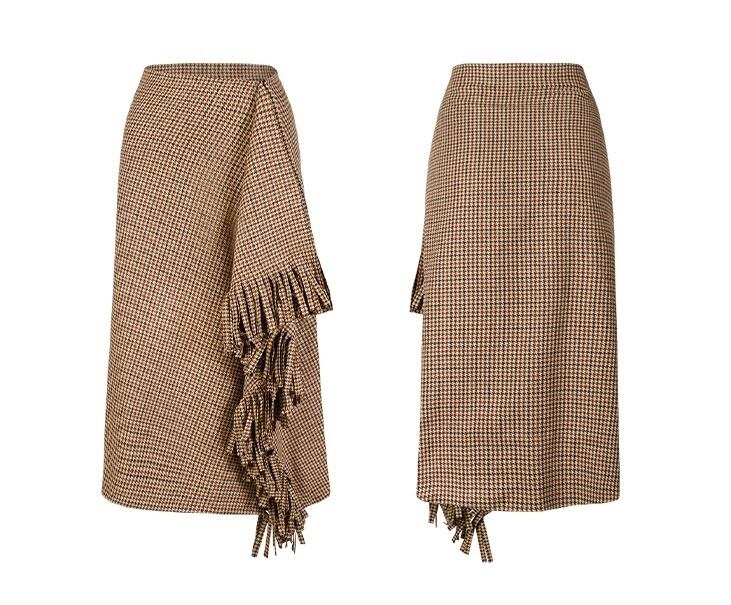 フロントにあしらわれたフリンジデザインが素敵な千鳥格子のタイトスカート。